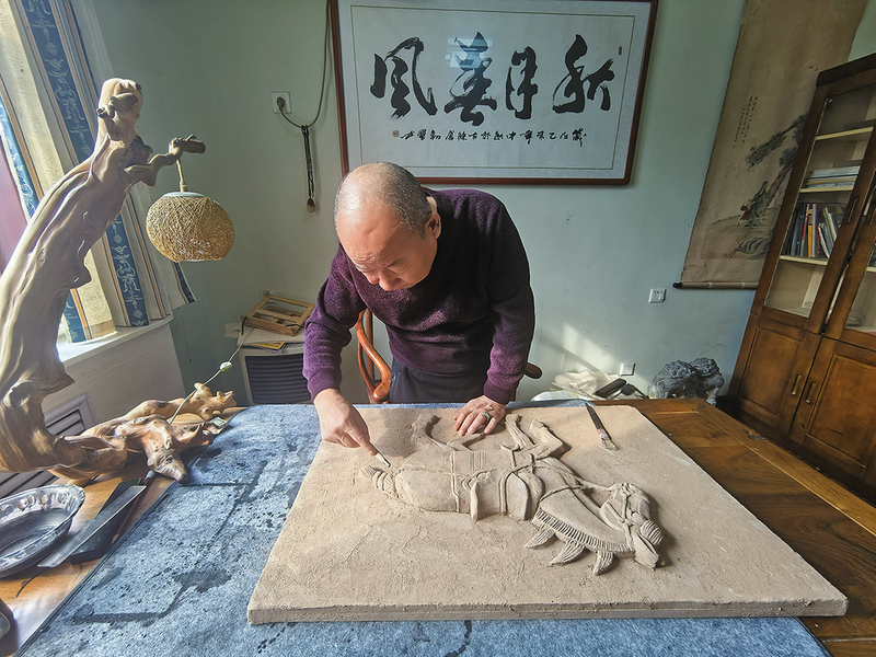 3月9日,马民安正在精修泥塑马。 本报记者 张恒 文/图