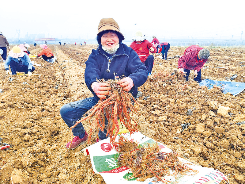 3月12日,永寿县监军街道古屯村中药材种植基地里,一派忙碌景象,当地群众正在采取丹参。据悉,古屯村目前种植丹参、柴胡、荆芥、黄芩等中药材200余亩,带动当地村民140余人就业。图为务工群众展示采收的丹参。