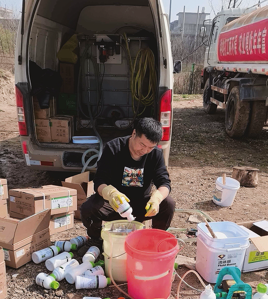 3月6日,赵森在给庄稼配药。 本报记者 张恒 文/图