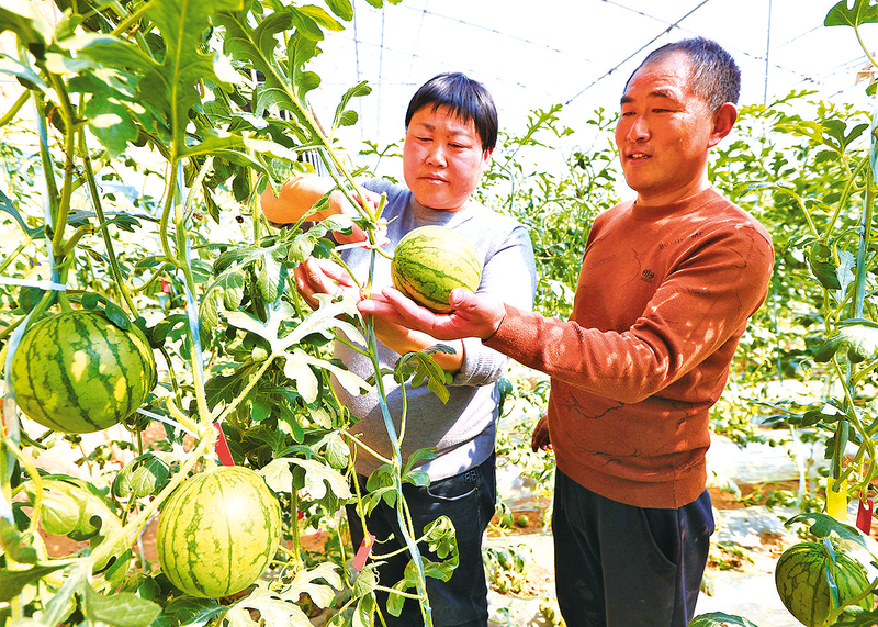 3月11日,大荔县羌白镇焦家村种植户张敏(左)和丈夫在采摘吊篮西瓜。