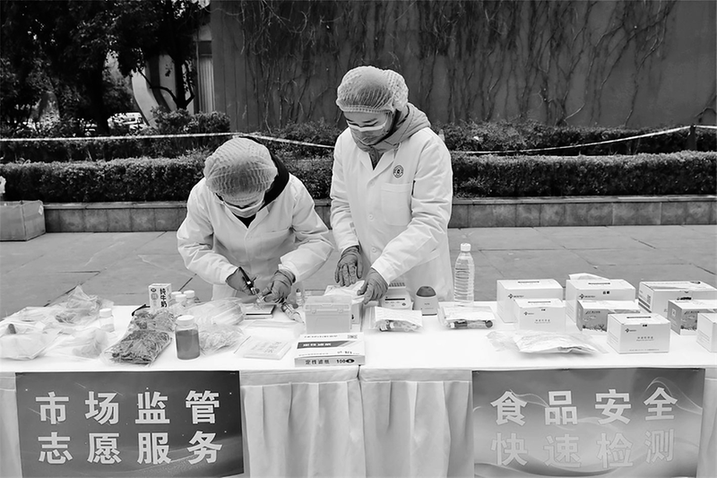 活动现场开展食品快速检测服务。 本报讯(记者 杨杰 文/图)为推动食品安全社会共治,营造安全放心的消费环境,3月15日,陕西省市场监管局、西安市市场监管局、西安市曲江新区分局联合举办“3·15”专题食品安全“你点我检”线下宣传活动。
