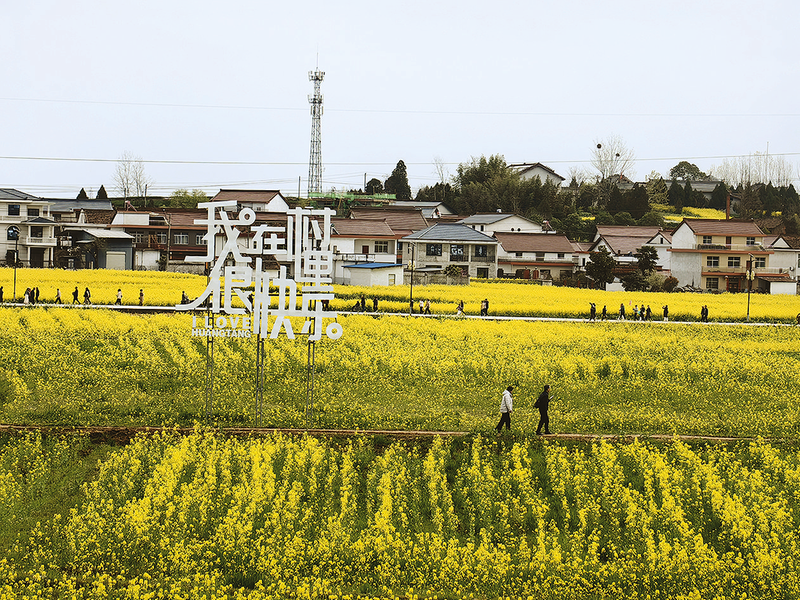 春日的皇塘村,仿佛一幅流动的田园画卷。田间、山川、村舍,天地之间,一片金色海洋,游人如织。不远处,身着汉服的游客,衣袂翩然与花海合影;岸边的舞台上,乐队激情演唱引来阵阵欢呼;观景小火车满载欢声笑语,在花海与溪流间缓缓穿行。
