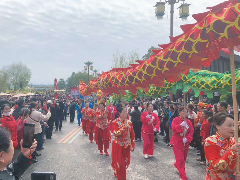 3月18日,皇塘水乡风景区非遗展演吸引游客驻足观看。