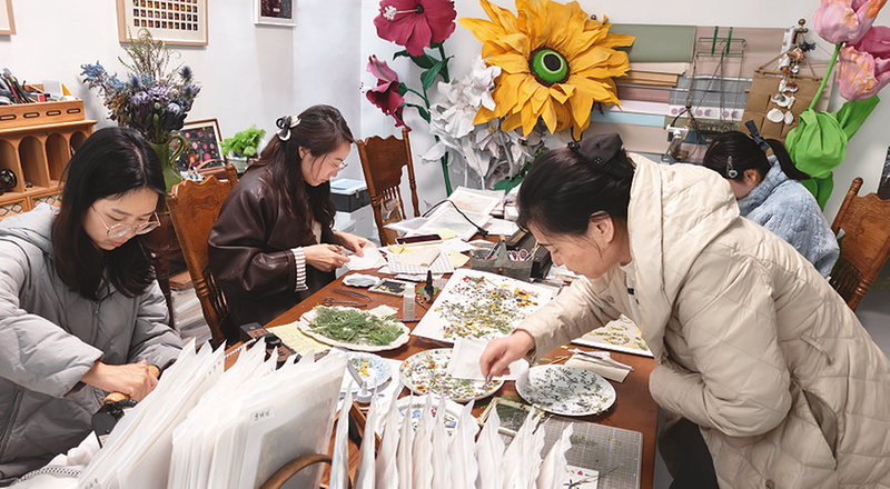 3月12日,学员们在工作室内聚精会神创作押花作品。 本报记者 杨杰 文/图