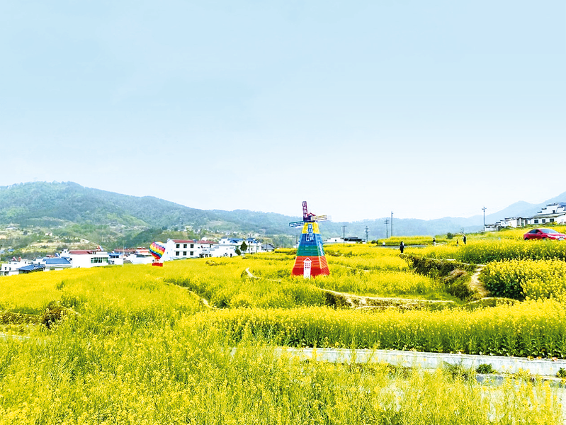花田间新修了步道,铺着青灰色的水泥和石子,蜿蜒着伸向村子深处。步道不宽,刚好容下三四个人并肩走,入口的门框上写着“儒林花海”四个字。