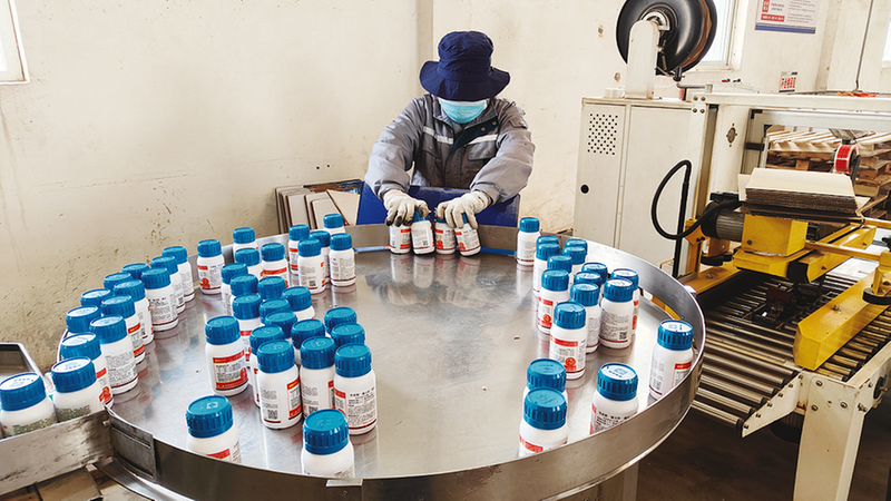 在陕西恒田生物农业有限公司车间内,工人将生产好的农药统一打包。(资料图)
