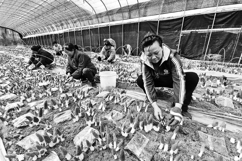 3月24日,宁强县大安镇宁家湾村村民在采摘羊肚菌。