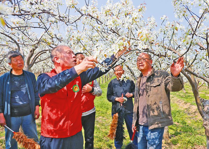 春日花开正盛,梨园进入花期管护关键期。连日来,大荔县果业技术服务队深入田间地头,开设流动课堂,手把手指导果农疏花、人工授粉与病虫害防治,助力梨园稳产丰产。图为3月31日,大荔县段家镇万亩梨园里,技术人员(左二)指导果农疏花。