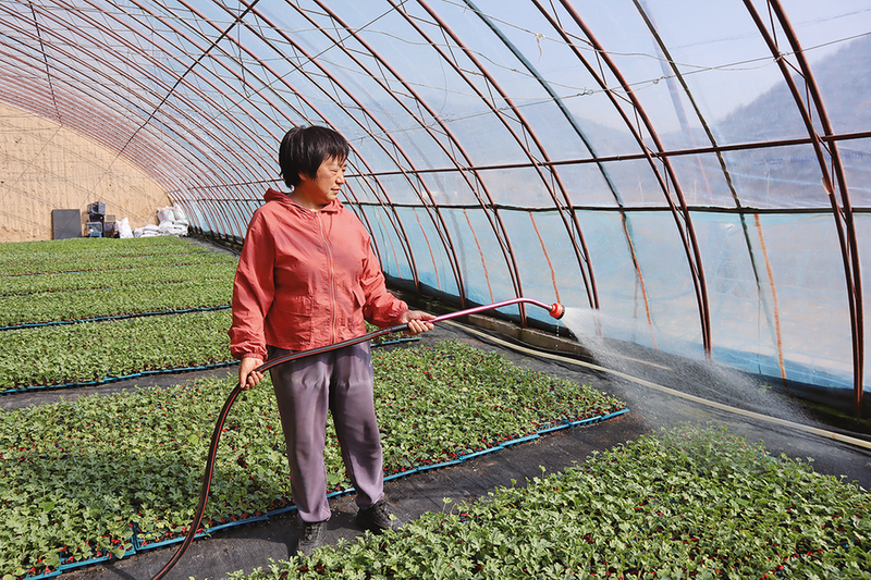 3月26日,李海红在给幼苗浇水。 本报记者 杨磊 通讯员 刘娟 文/图