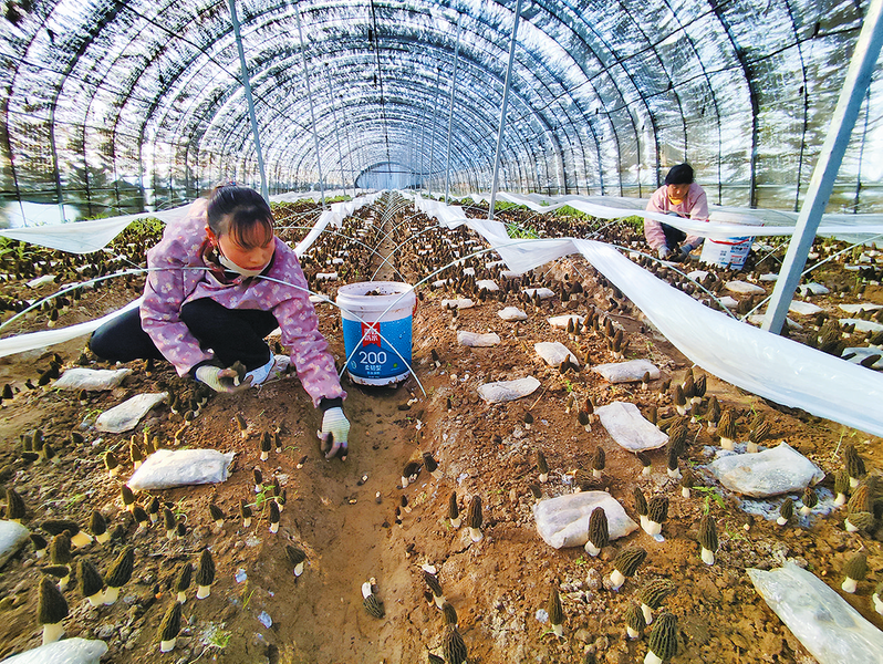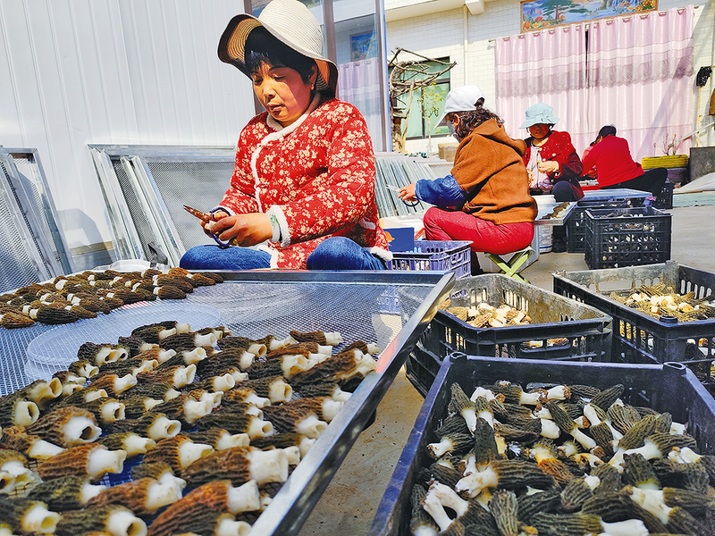4月9日,永寿县甘井镇赵家塬村村民在采收、分拣羊肚菌。