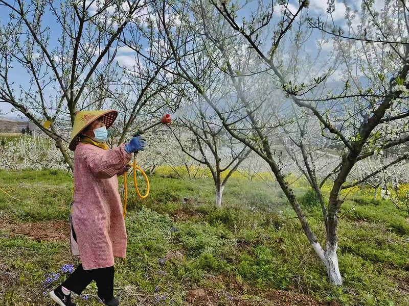 3月23日,长窖村村民沈继莲给果树喷药。 本报记者 李冀安 通讯员 刘东 熊乐 文/图