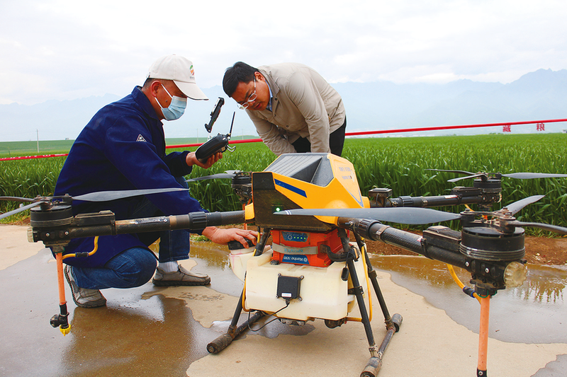 4月12日,西安市长安区王曲街道江兆村神禾塬粮食生产基地内,技术人员正在检查无人机设备,准备开展小麦“一喷三防”作业。