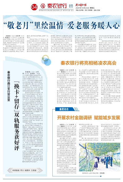本报讯(记者 王东宇 实习生 程嘉仪)10月22日,记者从秦农银行获悉:该行将作为参展金融机构,亮相第32届杨凌农高会。