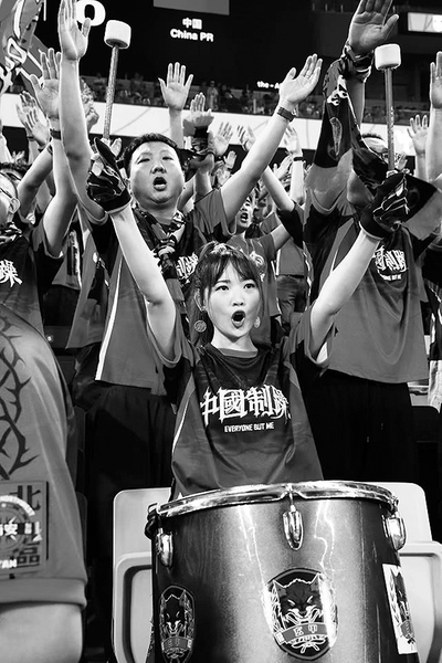 9月9日,2026年亚足联U-23亚洲杯预选赛D组比赛中,邱冬雨(前)用鼓声为中国队助威。(资料图) 本报记者 王东宇