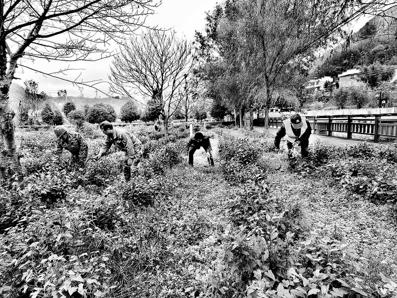 当前,茶园进入管护期,平利县广佛镇抢抓晴好天气,对全镇6227亩高效茶园实施分阶段管护。图为10月22日,该镇香河村茶园里,茶农正在锄草。
