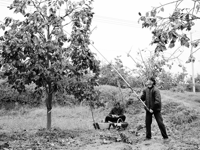 霜降节气过后,富平县进入柿子集中采摘期,柿农们穿梭其间收获柿子。图为10月23日,富平县宫里镇北陵村村民姚正运(右)正在采摘柿子。