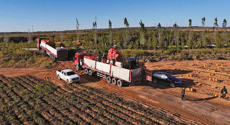 冷库里,新鲜果蔬堆成山,打包好的土豆、山药摆得整整齐齐。一辆辆货车在冷库外排队,等着将这些“沙地宝贝”运往全国各地。