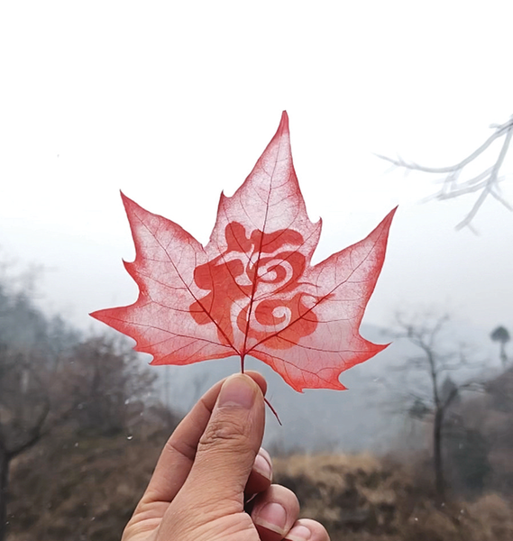李相龙立刻行动起来,但传统叶雕的技术瓶颈总是让他陷入困境。“天然枯黄的叶子,按照传统工艺需要发酵两三个月,待叶子变成暗色后才能雕刻。”他边演示边解释,传统方法需要先将图案刻在模板上,然后覆盖在叶片上,用细针和特制刷笔一点点“戳”,去除多余叶肉,留下网状叶脉形成图案。