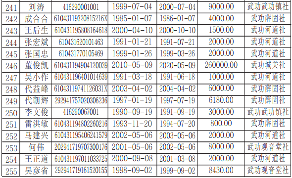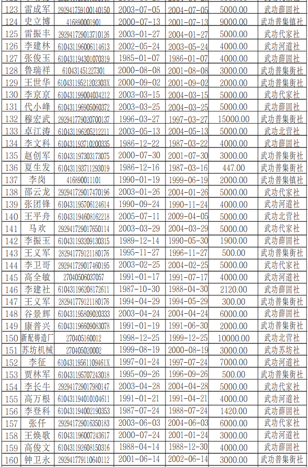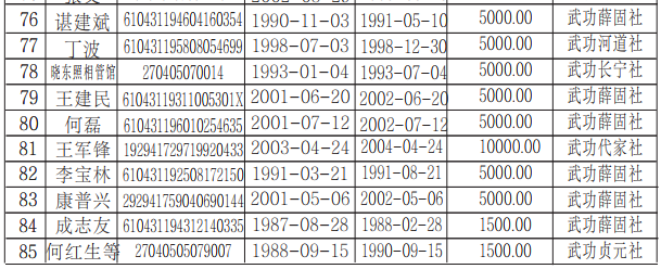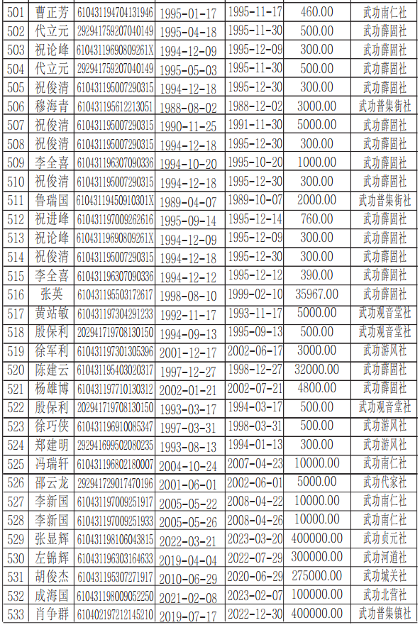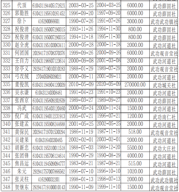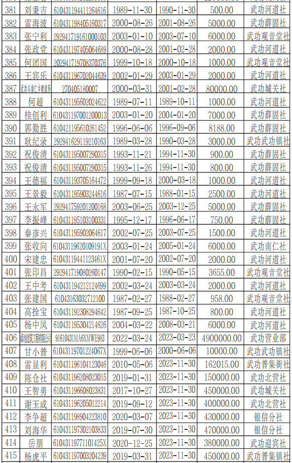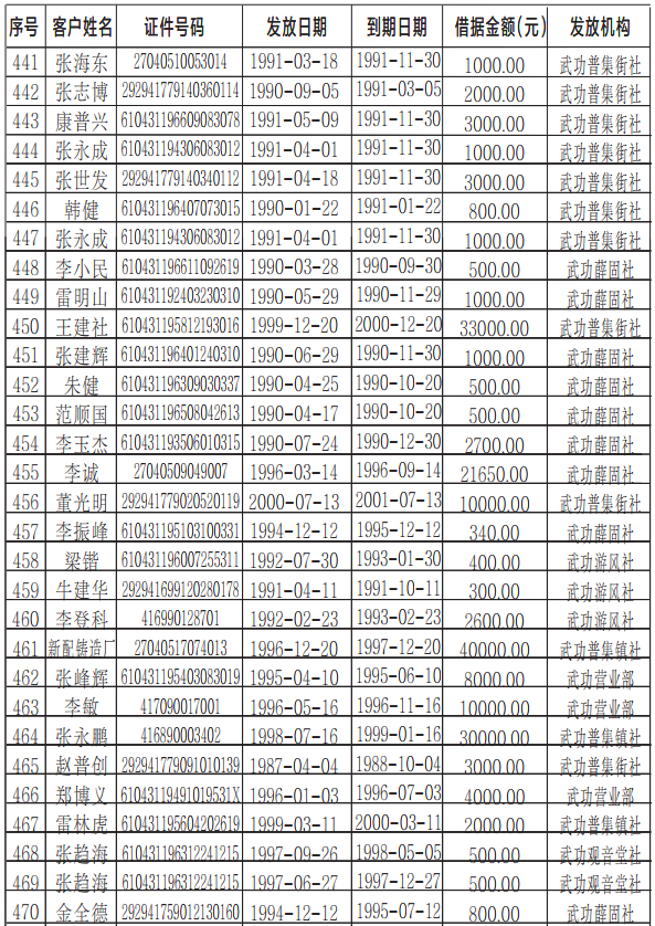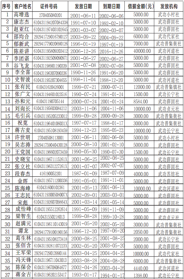 以下人员请在本公告发布之日起30日内主动到武功县农村信用合作联社办理还款事宜,逾期不还、不配合或者有意躲避者,我们将通过电视、报纸等公众媒体公布不良借款人及担保人的有关信息,由此引起的一切后果由借款人和担保人承担。同时,我们将按照法律程序,依法诉讼、强制执行。请各位借款人及担保人珍惜个人信用记录,主动承担还款义务,尽快偿还不良贷款本息,避免给你们的声誉和经济带来损失。