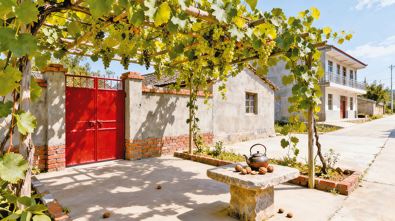 老屋土墙在几十年风雨侵蚀下,早已不堪重负。每逢雨天,墙皮剥落,掉土疙瘩。当年家里困难,只能勉强凑合着住。火灾过后,父亲与爷爷商量,决定修缮老屋。于是,漆黑的老木门换成了崭新发亮的大红铁门,斑驳的土墙砌成了结实的水泥砖墙,庭院也垒上了青砖,就连院中那架葡萄树,也重新搭起了棚架,藤条顺着木杆攀爬,绿意蔓延。