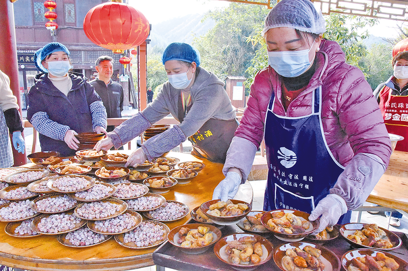 11月21日,宁强县青木川镇千人百桌辅唐宴在青木川景区开席。