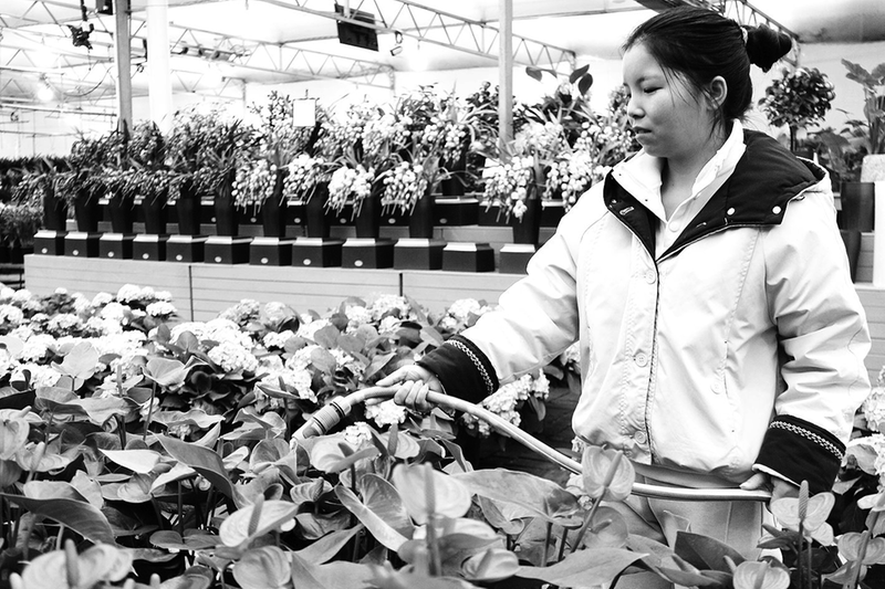 11月24日,西安市长安区黄良街道北良村村民余治芬,在家门口的花卉市场管护花卉。