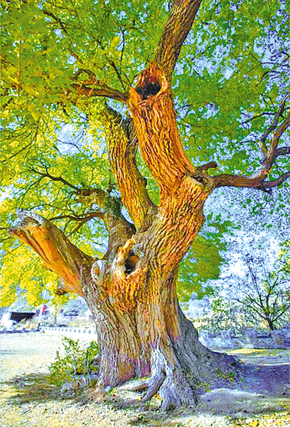 在我儿时的记忆里,除了木瓜园堡糜梁古道旁那棵百年以上的老槐树,唯有它,是全村唯一一棵称得上参天大树,远在村外就能望见它挺拔的身影。那时我常去井沟取水,都会在转弯的平台上歇脚,放下肩头的扁担,仰头看疏朗的树影斜铺在地面,风过处,树影浮动。可以说,我们村里这一代人的童年,都是在老槐树安静的注视里长大的。